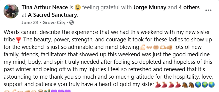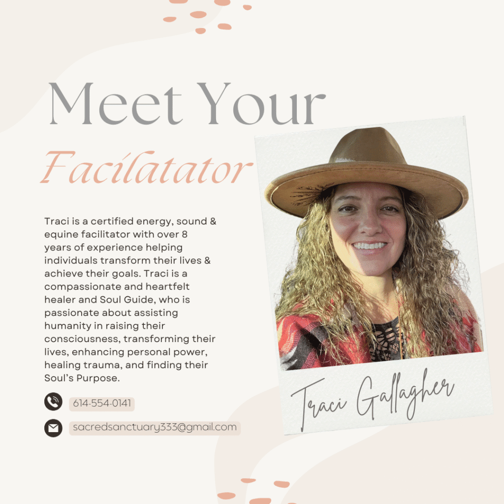 We will be offering the services of 6-8 different certified & licensed facilitators. If you don’t choose to participate in a particular activity we have horses on site, 13 acres, a nature preserve & Big Darby Creek behind the sanctuary for you to roam upon.